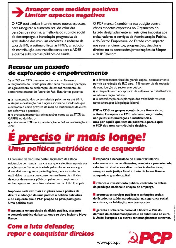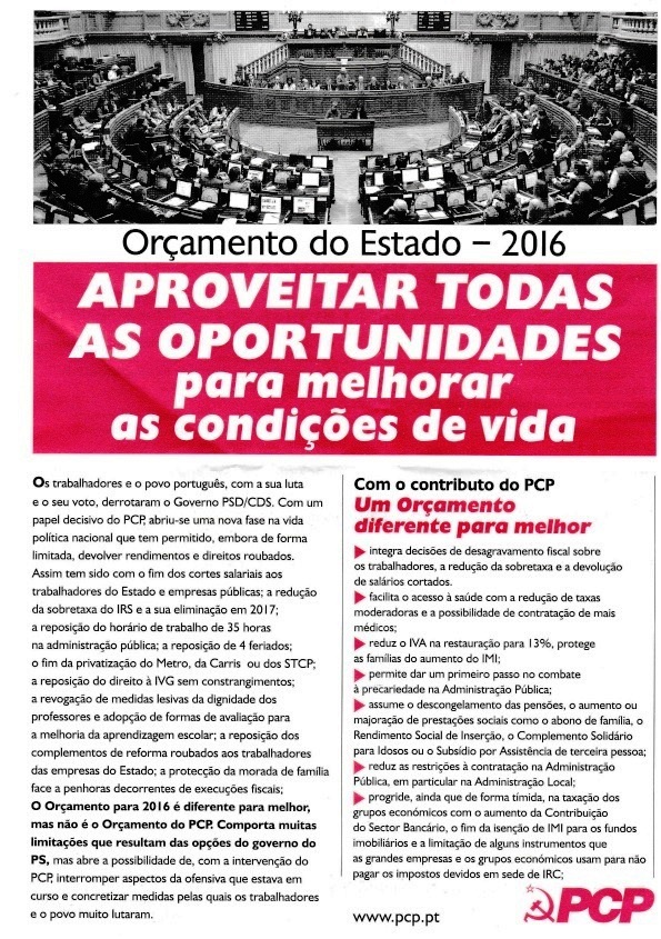 mesma incidindo na análise ao actual momento político nacional, recaindo naturalmente na inédita solução governativa consequência das eleições legislativas do passado dia 4 de Outubro para a qual contribuiu o PCP de forma decisiva. A aprovação do Orçamento do Estado para 2016 - linhas gerais e as propostas do Partido nele contidas tendo em vista a melhoria de condição de vida dos trabalhadores e do povo - foi elemento principal na intervenção, sem esquecer as perspectivas de trabalho futuro do PCP no plano institucional, partidário, laboral e social.