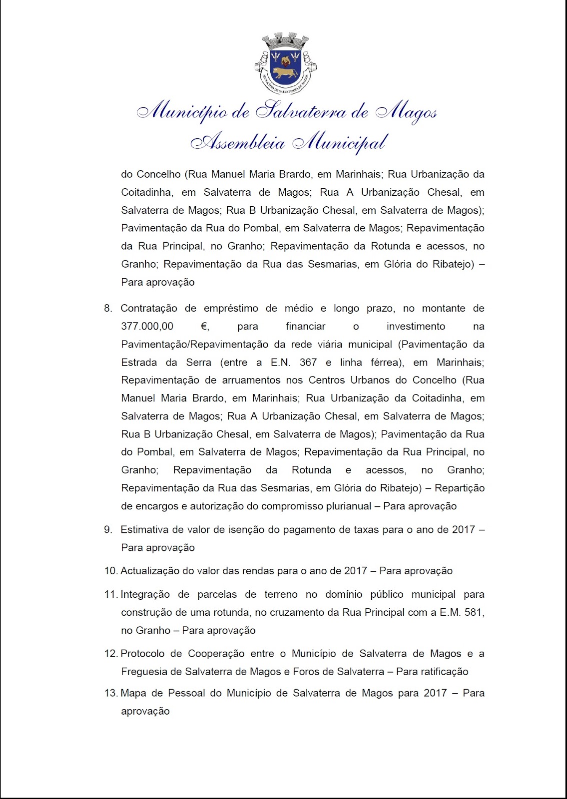 Realiza-se hoje, 21 de Dezembro pela 21h, no auditório da Escola Profissional de Salvaterra de Magos, uma sessão ordinária da Assembleia Municipal de Salvaterra de Magos, com a seguinte Ordem de Trabalhos: